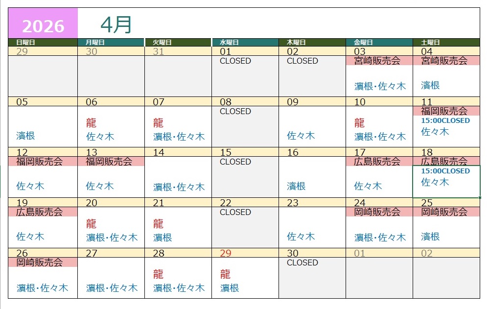 4月の営業時間及び龍の在店スケジュールをご案内いたします。